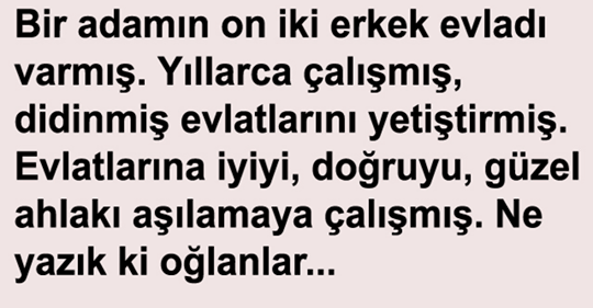 Bir adamın on iki erkek evladı varmış. Yıllarca çalışmış, didinmiş evlatlarını yetiştirmiş. Evlatlarına iyiyi, doğruyu, güzel ahlakı aşılamaya çalışmış. Ne yazık ki oğlanlar sürekli birbirleriyle didişiyorlardı. Elbette ki kimseye kalmayan dünya ona da kalmayacakmış. Baba hastalanıp ölüm döşeğine düşmüş.
