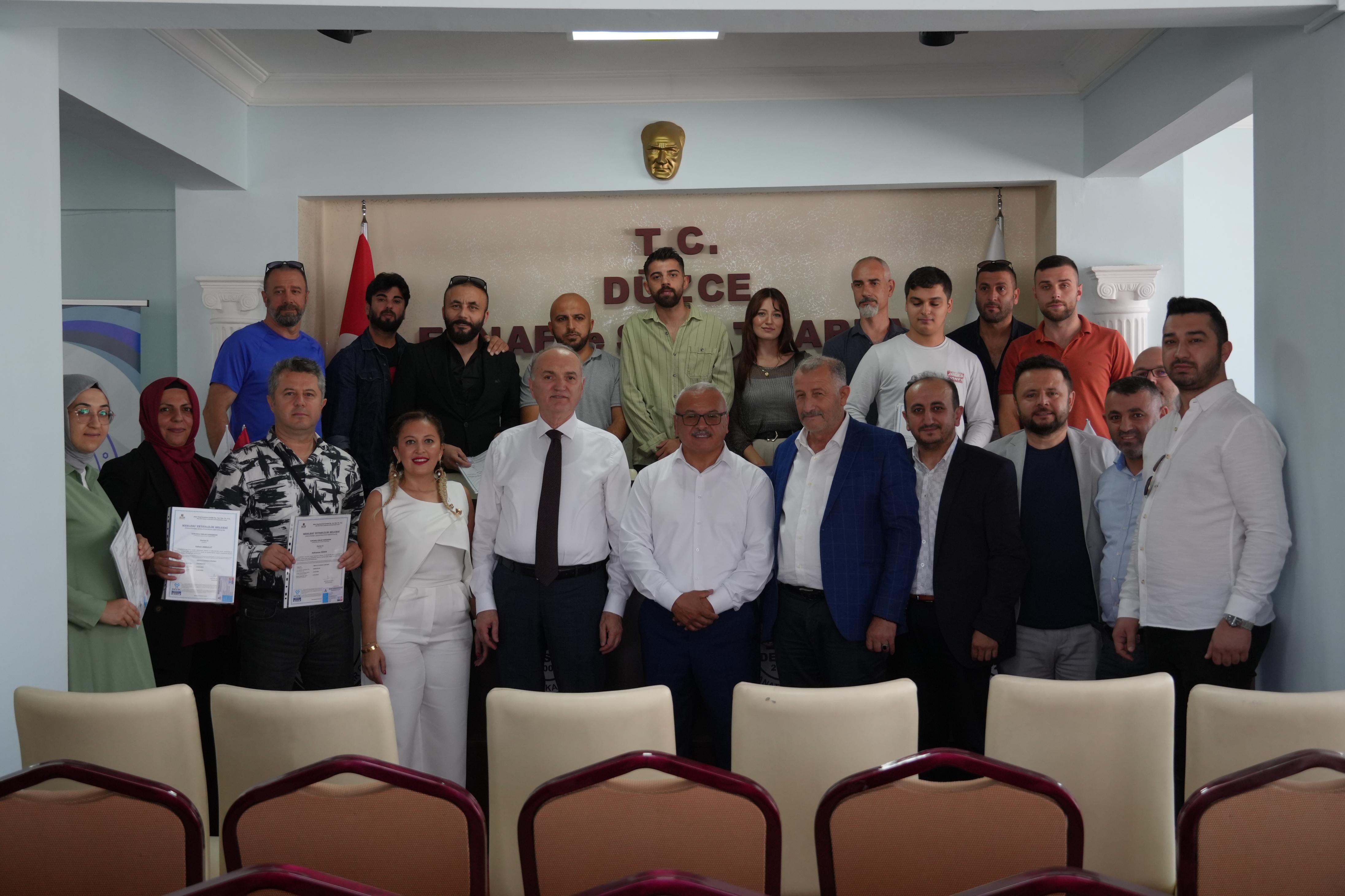 Düzce Belediye Başkanı Dr. Faruk Özlü, Yapı Sanatları Esnaf Odası’nda düzenlenen Mesleki Yeterlilik Belgesi dağıtım törenine katılarak, 32 kursiyere belgelerini teslim etti.