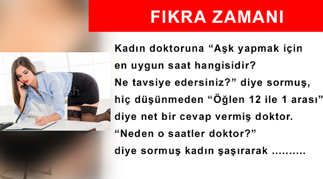 Kadın doktoruna “Aşk yapmak için en uygun saat hangisidir? Ne tavsiye edersiniz?” diye sormuş, hiç düşünmeden “Öğlen 12 ile 1 arası” diye net bir cevap vermiş doktor. “Neden o saatler doktor?” diye sormuş kadın şaşırarak. “Eee..” demiş doktor sesini kısıp gözüyle kapıyı kontrol ederek, “O saatler arasında sekreterim öğle yemeğine çıkıyor..”