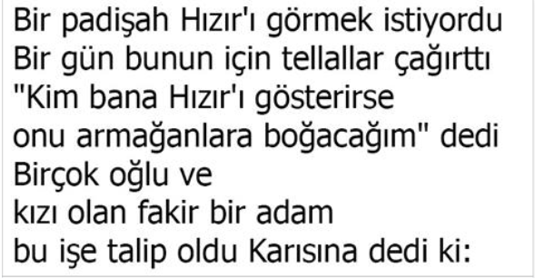 Herşey Aslına Çeker Bir padişah Hızır’ı görmek istiyordu Bir gün bunun için tellallar çağırttı “Kim bana Hızır’ı gösterirse onu armağanlara boğacağım” dedi Birçok oğlu ve kızı olan fakir bir adam bu işe talip oldu Karısına dedi ki