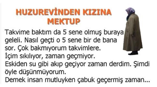 Beni buraya bıraktığın gün... anneler günüydü hatırlıyor musun? O günden beri anneler günü denen gün benim için daha da bir anlamsızlaştı. Her sene bugün anne olmak ayrı bir acı veriyor bana… Sen küçük bir çocuktun daha. Hiç bir yere bırakmazdım ben seni, öyle savunmasız, öyle masumdun ki, kimselere güvenip yollamazdım. Yanımdan hiç ayırmazdım. GÖZDEN ÇIKARILMIŞ ESKİ BİR EŞYA GİBİYİM… Şimdi beni nasıl olup ta tanımadığın insanlara teslim ettiğini düşünüyorum. Gözden çıkarılmış eski bir eşya gibi hissediyorum kendimi. Yıpranmış, işe yaramaz. Kırgınlık mı? Belki, kırgınım biraz… Geçen gün eski komşumuz Mevlüde teyzenin kızı Şükran geldi. Yolda görmüş seni. “Neden bıraktın anneni” diye sormuş sana. “Kendisi istedi” demişsin. “Maaşı da var bakıyorlar, yeri sıcak, her işi görülüyor içim rahat” demişsin. Kendim istemiştim evet, bazen naz yapma kabilinden ”
