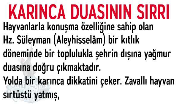 Hayvanlarla konuşma özelliğine sahip olan Hz. Süleyman (Aleyhisselâm) bir kıtlık döneminde bir toplulukla şehrin dışına yağmur duasına doğru çıkmaktadır. Yolda bir karınca dikkatini çeker. Zavallı hayvan sırtüstü yatmış, ayaklarını göğe doğru uzatmış, çırpınırken dua etmektedir.