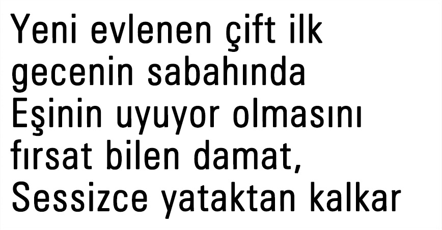 bahçenin en güzel köşesine masa ve sandalyeyi taşır. Yeşillikler içerisinde harika bir masa hazırlamaya başlar. Bal, süt, kaymak, reçel, çikolata, yumurta, tahin, pekmez, domates, salatalık derken müthiş kahvaltı hazırlıkları son bulmak üzeredir. Neredeyse “Bir tek kuş sütü eksik” denecek cinsten bir kahvaltı olmuştur. Son olarak bahçeden topladığı gülleri de masanın ortasına koyarak mışıl mışıl uyuyan karısının yanına gider. Gayet kibar bir ş ekilde uyandırdığı karısını bahçeye davet eder. Bütün olan bitenlerden habersiz olan gelin, elini yüzünü yıkayıp bahçeye çıkar. Gördükleri karşısında ne diyeceğini şaşırır. Mutluluk, şaşkınlık hepsi bir birine girmiş durumdadır. Karısının sandalyesini çekip oturmasını sağlayan damat son adım olarak ta karısının çayını doldurur ve onu öperek şöyle der; – “Bundan sonra sabah kahvaltılarını böyle istiyorum karıcığım”