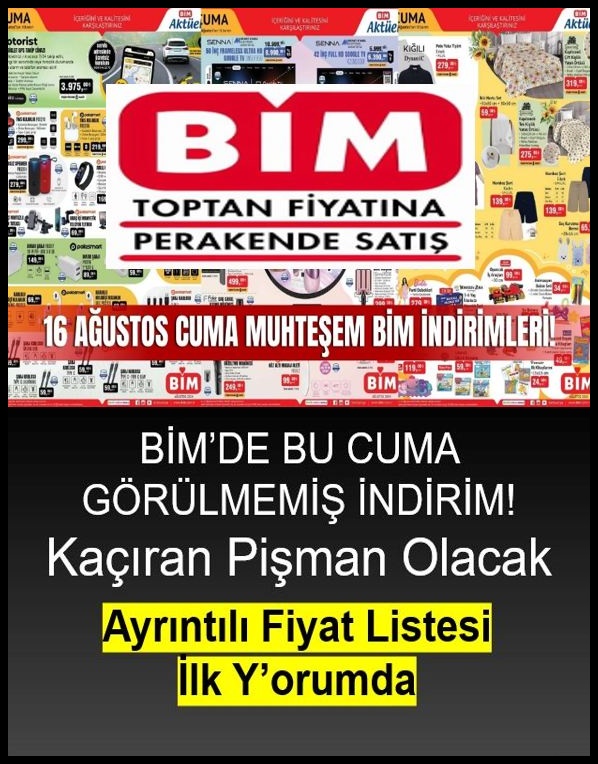 15 Ağustos 2024 Perşembe 00:44Elektrikli Ev Aletleri ve Kişisel Bakım Ürünleri BİM'in aktüel kataloğunda, ARNİCA markasıyla 2 yıl garantili Arnica Cyclone Elektrikli Süpürge, 2,975 TL'den satışa sunuluyor. Kişisel bakım ürünleri arasında ise Range Mini Saç Kurutma Makinesi 399 TL ve Range Epilasyon Aleti 249 TL gibi fırsatlar bulunuyor. Züccaciye ve Mutfak Ürünlerinde Fırsatlar Züccaciye kategorisinde Glass in Love markasının ürünleri ön planda: 4'lü Cam Pasta Tabağı: 149 TL 3'lü Cam Ayaklı Dondurma-Tatlı Kasesi: 79 TL 6'lı Cam Kupa: 89 TL KATALOGLARIN DEVAMI DİĞER SONRAKİ SAYFADA...