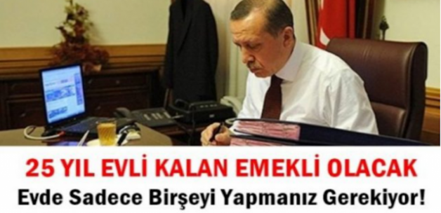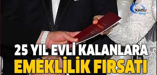 25 Yıl Evli Kalana Emeklilik Tek Şartla.Sigortalı olmayan ev kadınlarının emekli olabilmesi için Meclis’e kanun teklifi verildi. Teklif yasalaşırsa, evliliklerinde en az 25 yılını tamamlayan kadınlar faydalanabilecek. Ev Hanımlarının Emekli Olması İçin Meclise Kanun Teklifi Verildi 25 Yıl Evli Kalan Ev Hanımlarına Emeklilik Geliyor.