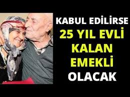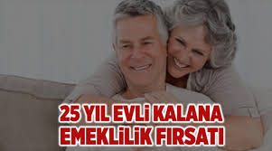 Teklifin yasalaşması halinde ev hanımları da özlemini duyduğu mutluluğa ulaşarak emekli olabilecek.Yani 25 yıllık evlilere emeklilik hakkı gelecektir.Ancak, yine teklife göre bunun belli şartları bulunmaktadır. Bu şartları 3 şekilde sayabiliriz. 1) Sosyal Güvenlik Kurumu ile herhangi bir bağ olamayacak, 2)Evlilik süresinin 25 yıl ve daha üzeri olması gerekmektedir, 3)Belli bir süre sigortalı olarak sosyal güvenlik sisteminde kaydı bulunduğu halde şu an için Sosyal Güvenlik Kurumu ile bağın bulunmaması gerekir. Ev Hanımlarına Emeklilik İçin Ne Yapılması Gerekiyor? 25 Yıl Evli Kalan Ev Hanımlarına Emeklilik Geliyor. 25 Yıllık Ev Hanımlarına Emeklilik Hakkı 2017. 25 yıllık evlilere emeklilik şartlarını yukarıda belirtmiştik.Bu şartları sağlayan kadınlar,kanunda belirlenen yaş sınırı ve prim gün sayısı esas alınmak şartıyla ve kanunda belirlenen kazanç sınırları içinde hesaplanacak tutarları peşin ödeyerek veya borçlanarak yaşlılık aylığı almaya yani emekli olmaya hak kazanacaklardır.Yani emekli olmak için yine biraz da olsa ödeme yapılacaktır.