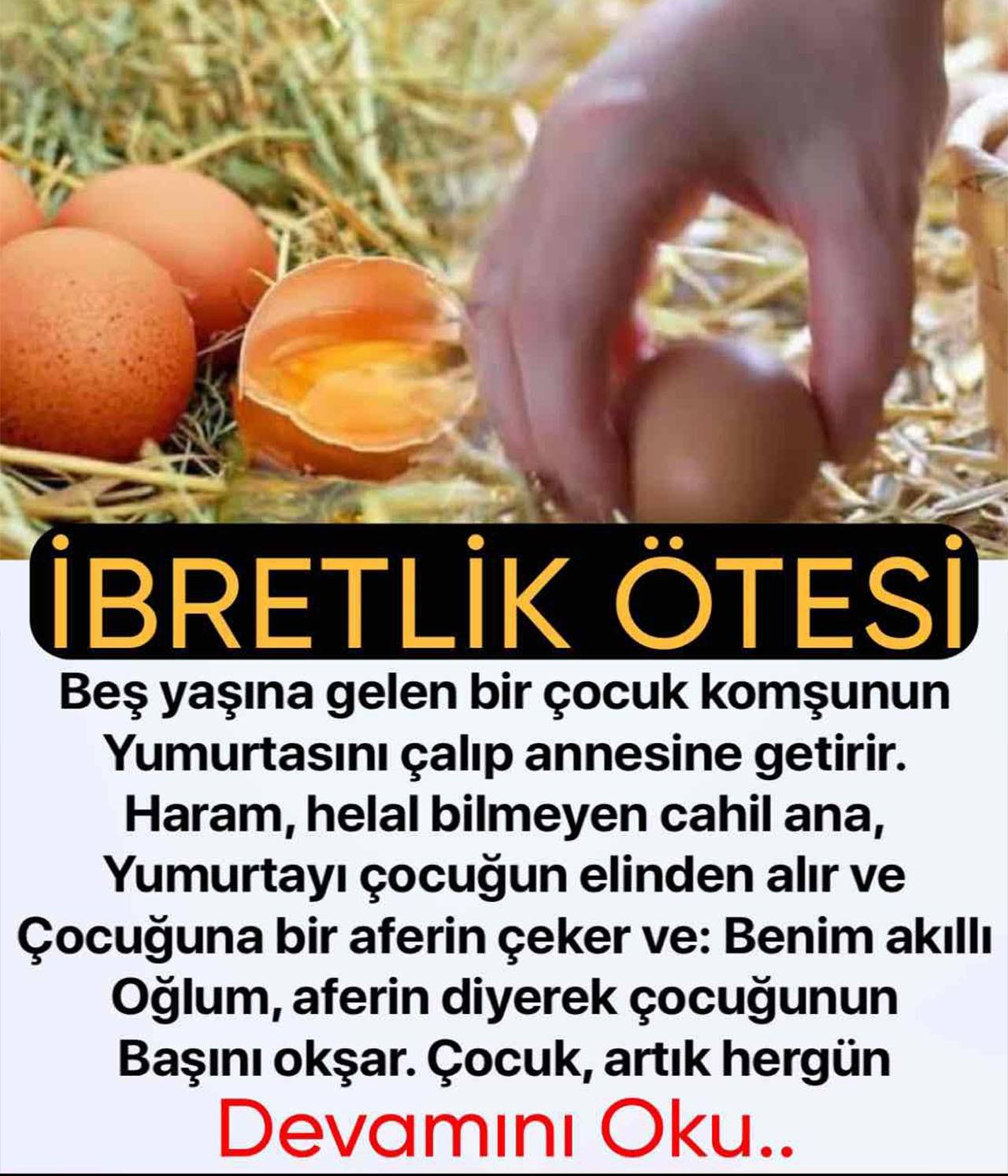 28 Mayıs 2022 Cumartesi 00:33Beş yaşına gelen bir çocuk komşunun Yumurtasını çalıp annesine getirir. Haram, helal bilmeyen cahil ana, Yumurtayı çocuğun elinden alır ve Çocuğuna bir aferin çeker ve: Benim akıllı Oğlum, aferin diyerek çocuğunun Başını okşar. Çocuk, artık hergün veya gün aşırı komşuların yumurtalarını eve getirmeye başlar. Bir gün böyle, iki gün böyle derken seneler geçer. Çocuk yaşına göre hırsızlığı da ilerletir. Yumurtadan tavuğa, tavuktan horoza, horozdan koyuna, koyundan kuzuya derken bir haramzâde olur çıkar.