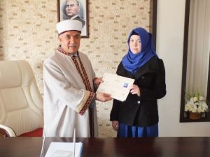 Müftü Hasan Çağlar, Müslümanlığı seçen Ayşe’ye ihtida belgesi ile Kur’an-ı Kerim’in Almanca meali ve Diyanet İşleri Başkanlığı yayınlarından eserler hediye etti.
