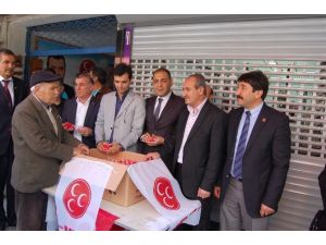 Mevlid-i Şerif okunmasının ardından İlçe Başkanı Semih Aksoy ve partililer ilçe binasının önünde katılımcılara, vatandaşlara ve esnaflara hurma dağıttı.