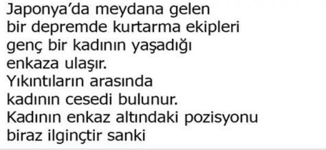 19 Ekim 2016 Çarşamba 17:24Japonya’da meydana gelen bir depremde kurtarma ekipleri genç bir kadının yaşadığı enkaza ulaşır. Yıkıntıların arasında kadının cesedi bulunur. Kadının enkaz altındaki pozisyonu biraz ilginçtir sanki ellerinde bir şey tutarak iş yaparken dizlerinin üzerine çokmüş halde iken sanki ev üzerine yıkılmış gibi görünmektedir.