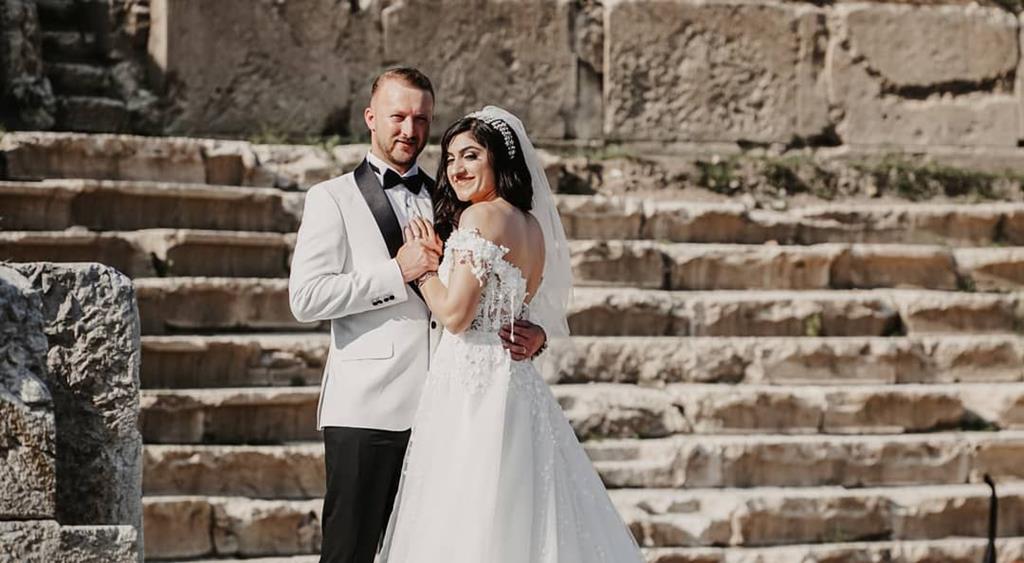 Konuralp Antik kentin tarihinde güzel anılar biriktirmek isteyen çiftler, basamaklara çıkarak fotoğraf çekiliyor.