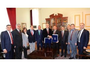Bursa Ardahan Dernekleri Federasyonu’nun ev sahipliğinde Ardahan Valisi Ahmet Deniz, Ardahan Belediye Başkanı Faruk Köksoy, Ticaret Sanayi Odası Başkanı Çetin Demirci, Posof İlçe Kaymakamı Ufuk Özen Alibeyoğlu, Posof Belediye Başkanı Cahit Ulgar, Ardahan Dernekler Federasyonu Başkanı Zekai Aydın ve yönetim kurulunun katıldığı heyet, Bursa Valisi Münir Karaoğlu’nu makamında ziyaret etti. Vali Karaoğlu: "Serhat Şehrimiz ile Ulu Şehrimizin Kardeşliğin de ötesinde bir iş birliği yapma zamanı gelmiştir" dedi.