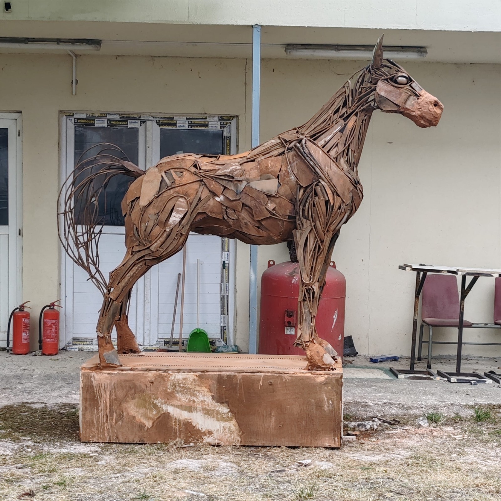 Atık malzemelerin yeniden değerlendirilmesiyle üretilen bu heykel, öğrencilere uygulamalı üretim deneyimi kazandırmanın yanı sıra, çevre bilinci ile sanatı buluşturarak ilham verici bir örnek teşkil ediyor.