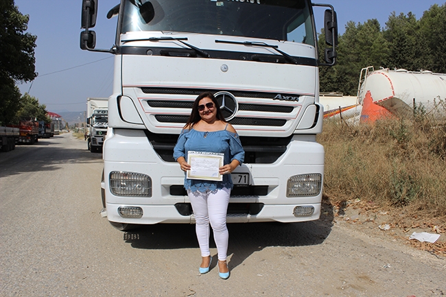 01 Ağustos 2017 Salı 21:19Tire’de TIR ehliyeti alabilen ilk kadın ünvanına sahip olan Gacan, aynı zamanda TIR ehliyeti için direksiyon eğitimi de verecek. Tek sınavda ehliyeti almaya hak kazandığını söyleyen Gacan, yaptığı açıklamada şu ifadelere yer verdi; “Uzun zamandır almayı hayal ettiğim ehliyetime nihayet sahip oldum. Bu ehliyet, kadınların da erkeklerin yaptığı her şeyi yapabildiklerini bir kez daha gösterdi. Çalışınca her şey oluyor. Siz yeter ki isteyin” dedi.