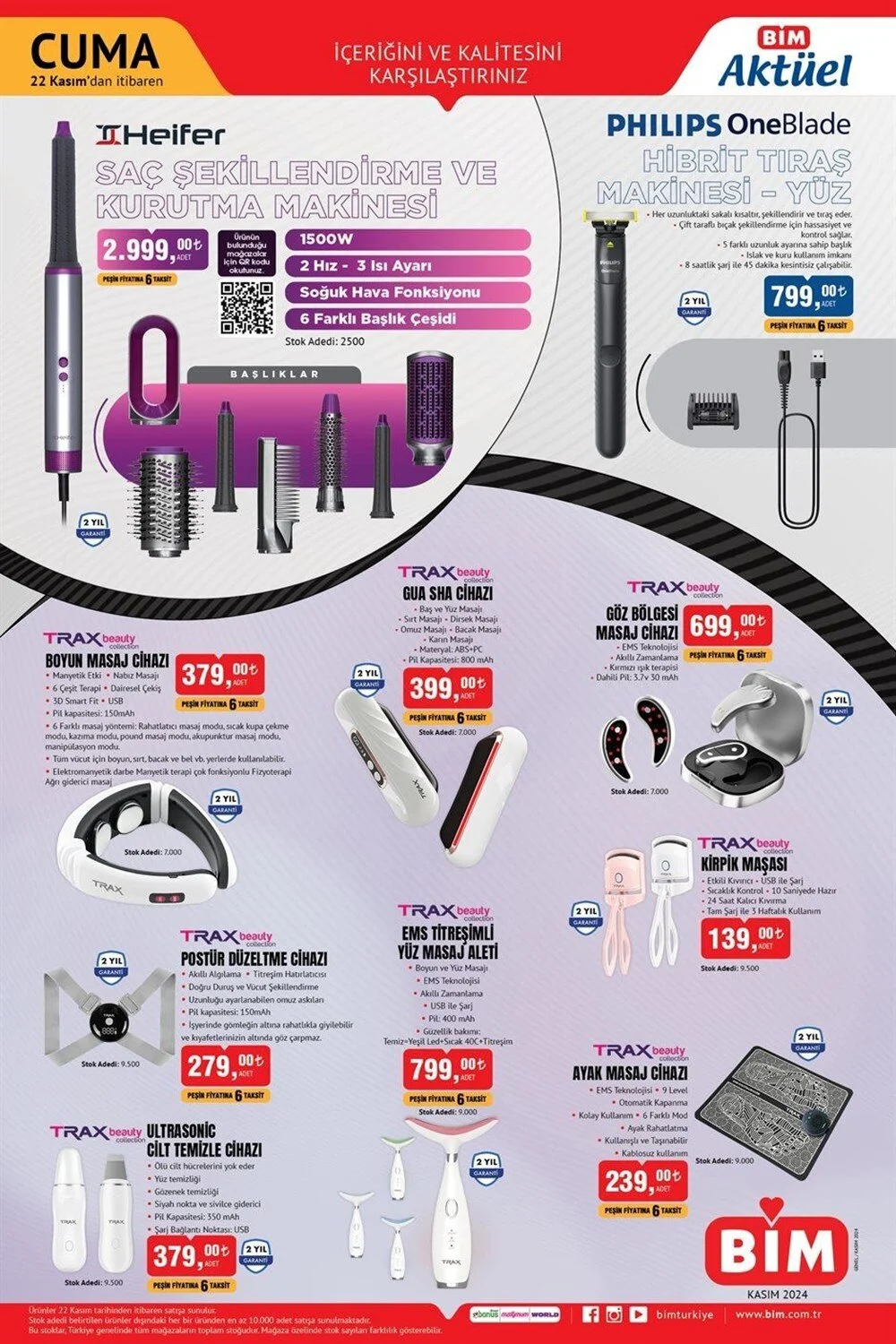 22 Kasım 2024 Cuma 19:58BİM aktüel indirimleri 22 Kasım 2024: BİM markette bu haftaya özel yeni indirimli ürünler listesi yayımlandı BİM market, 22 Kasım tarihinde geçerli yeni indirimli aktüel ürünler kataloğunu resmi internet sitesi üzerinden duyurdu. BİM indirimlerini kaçırmak istemeyen ve ucuz yolla alışveriş fırsatını değerlendirmek isteyen vatandaşlar, BİM güncel indirimli aktüel ürünler kataloğunu araştırıyor. BİM'de bu hafta lady shaver, saç sakal düzeltme cihazı, kadın bakım ürünleri, dikey ısıtıcı, kazanlı ütü, doğrayıcı gibi birçok üründe yeni indirimler yer alıyor. İşte 22 Kasım BİM markette bu haftanın indirimli ürünleri. Brojür 2 Brojürlerin devamını görmek ve fiyatları okumak için Lütfen sonraki sayfaya geçiniz..