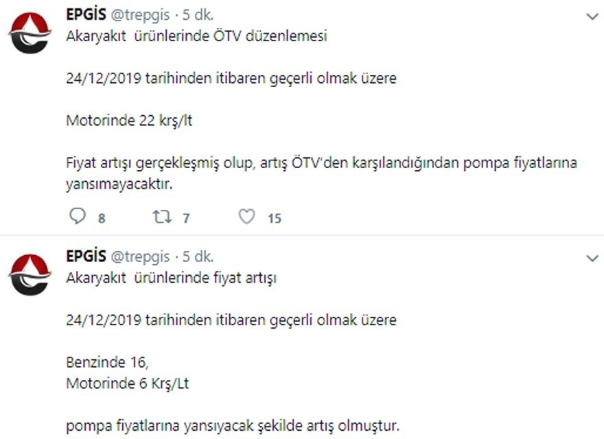 24 Aralık 2019 Salı 18:30Zammın 6 kuruşunun pompa fiyatlarına yansıyacağı, 22 kuruşun da ÖTV’den karşılandığından pompa fiyatlarına yansımayacağı belirtildi. ZAMLI FİYATLAR İstanbul’da benzin fiyatları 6.86 TL’den 7.02 TL’ye yükseldi. Motorin fiyatları ise 6,47 liradan 6,53 liraya yükseldi.