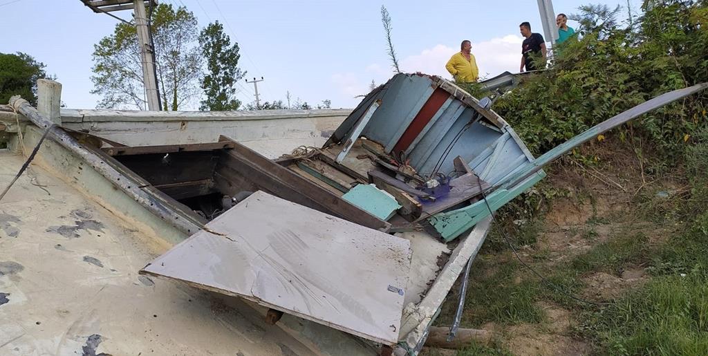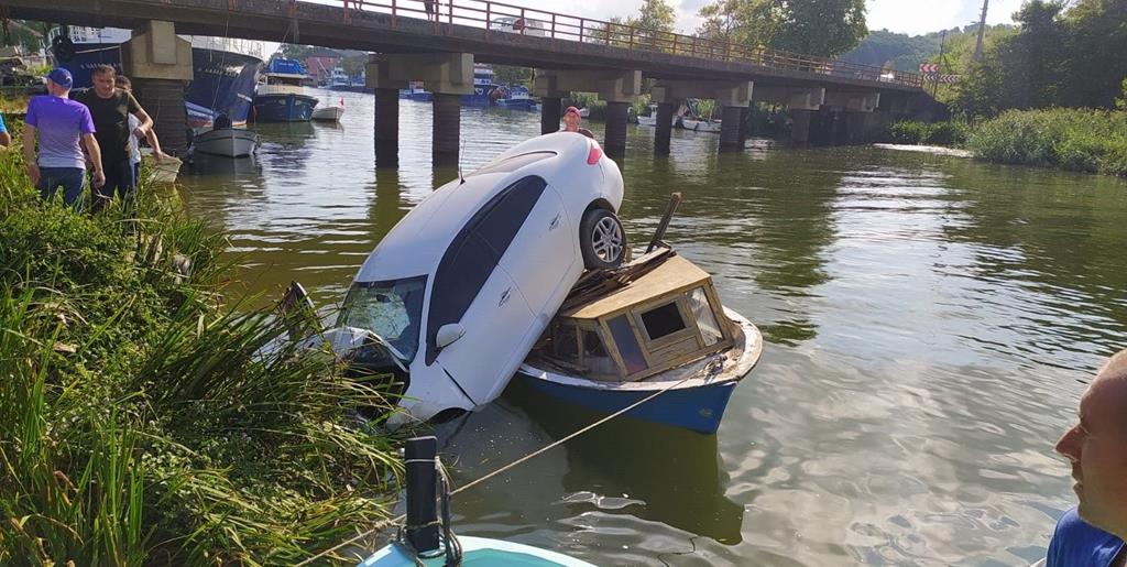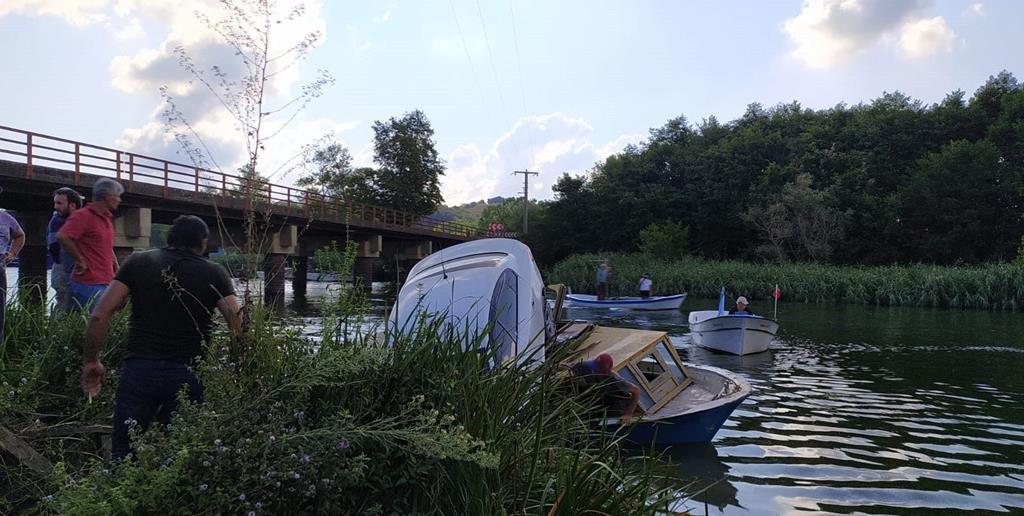 Düzce’nin Akçakoca ilçesinde virajı alamayan otomobil, Melen Çayı’nda bulunan bir teknenin üzerine uçtu.
