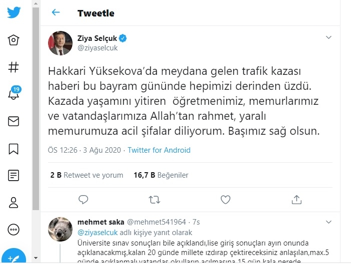 Milli Eğitim Bakanı Ziya Selçuk, sosyal paylaşım sitesi Twitter’daki hesabından başsağlığı mesajı yayımladı: Hakkari Yüksekova’da meydana gelen trafik kazası haberi bu bayram gününde hepimizi derinden üzdü. Kazada yaşamını yitiren öğretmenimiz, memurlarımız ve vatandaşlarımıza Allah’tan rahmet, yaralı memurumuza acil şifalar diliyorum. Başımız sağ olsun.