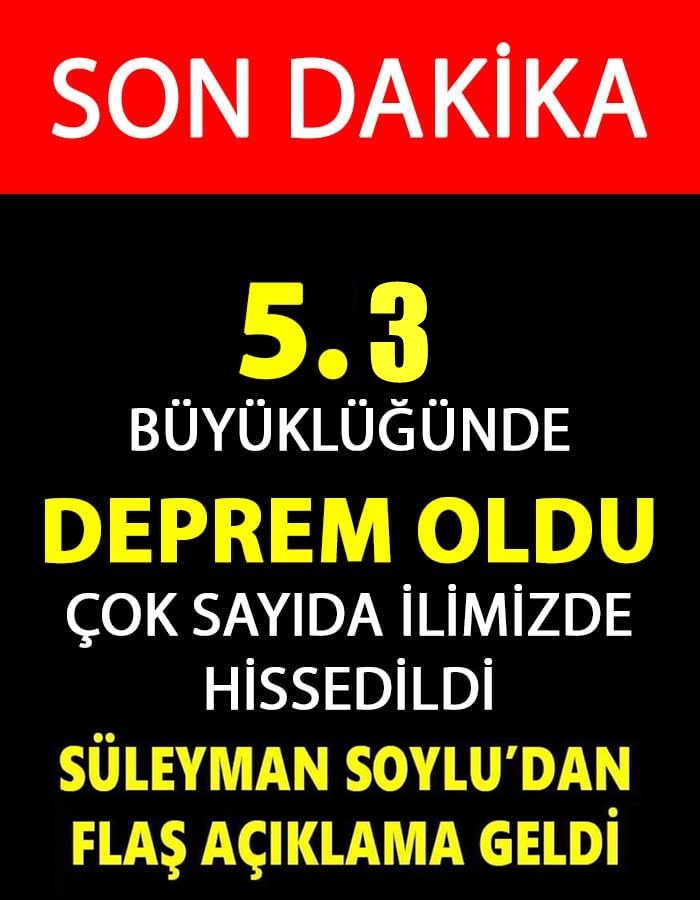 27 Aralık 2020 Pazar 19:47Elazığ merkezde, Richter ölçeğine göre, 5.3 büyüklüğünde deprem meydana geldi. Deprem, Diyarbakır, Malatya ve Şırnak gibi bölge illerinde de hissedildi. Kentte dün de 4.1 büyüklüğünde deprem meydana gelmişti. İçişleri Bakanı Süleyman Soylu ise 5.3'lük depremin ardından şu ana kadar olumsuz durumun olmadığını açıkladı.