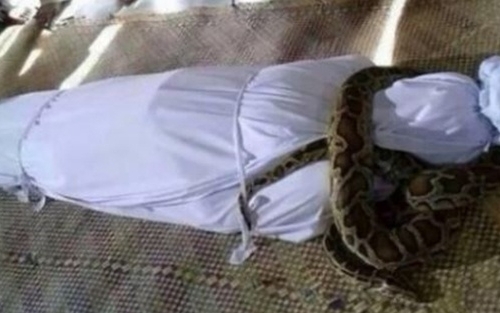 31 Ekim 2016 Pazartesi 17:21Sosyal medyada paylaşılan fotoğraf kareleri insanın tüylerini diken diken ediyor. Nerede çekildiği bilinmeyen fotoğraflarda, kocaman bir yılan, bir naaşın etrafını sarmış vaziyette görünüyor.
