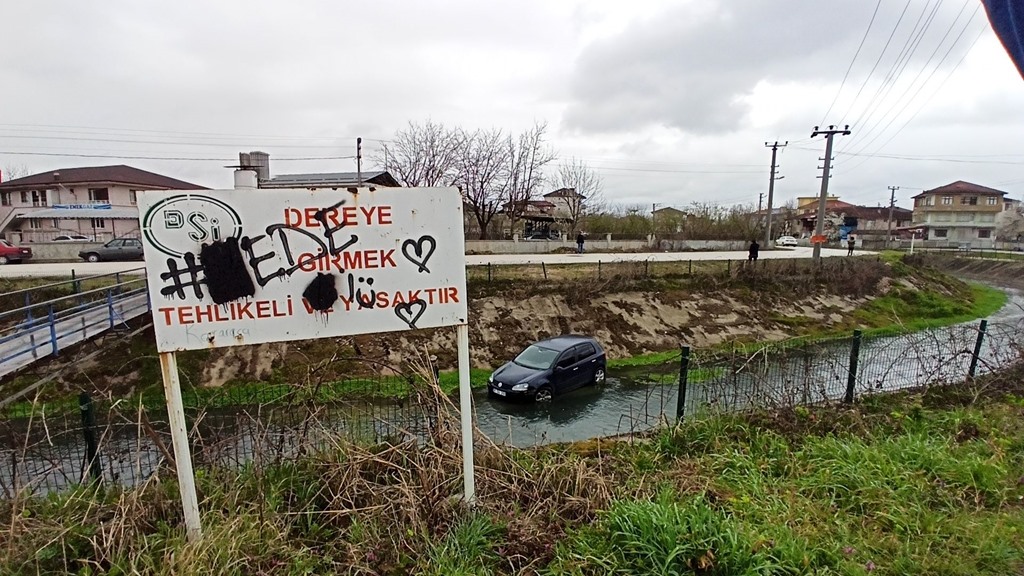 Derenin içindeki otomobili görenler büyük şaşkınlık yaşarken, DSİ’ye ait tabelanın hemen altında olan kazada ilginç görüntüler oluştu.
