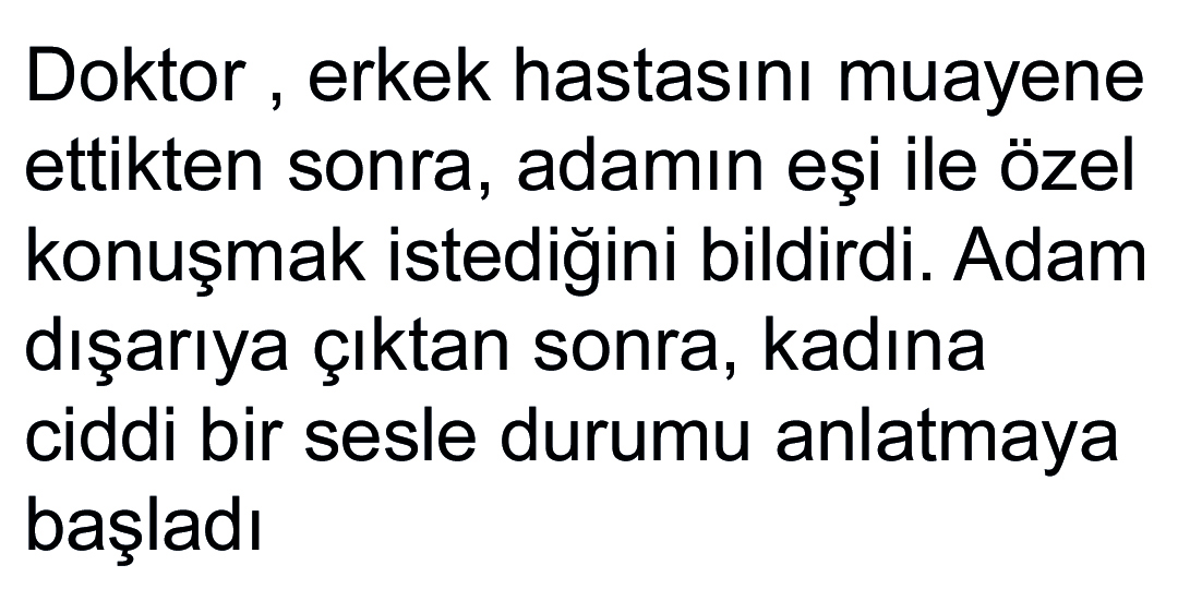 Doktor , erkek hastasını muayene ettikten sonra, adamın eşi ile özel konuşmak istediğini bildirdi. Adam dışarıya çıktan sonra, kadına ciddi bir sesle durumu anlatmaya başladı: ‘Eşinizin hastalığı ciddi’ dedi. ‘Korkunç bir stres’i var.