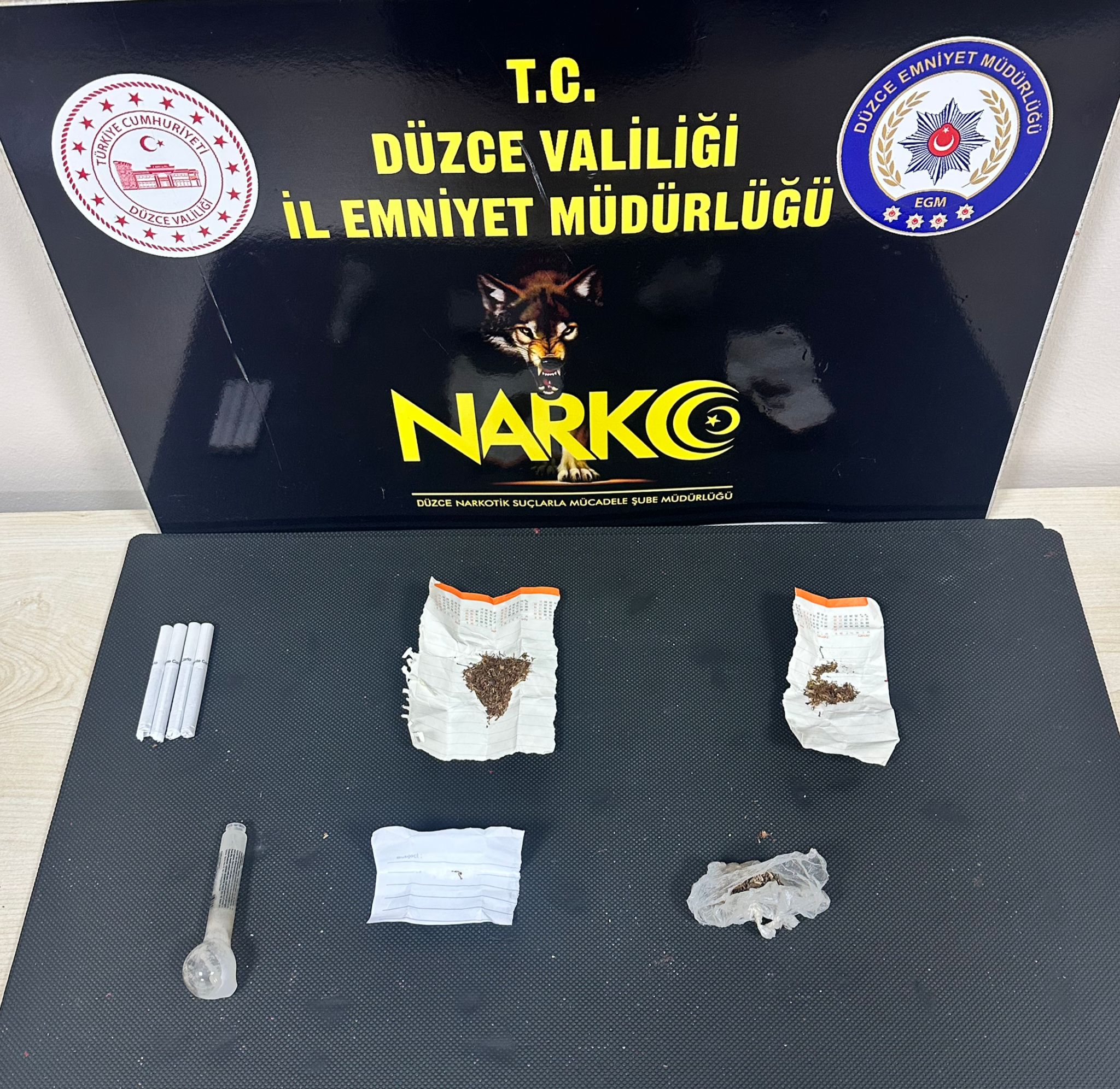 Düzce Cumhuriyet Başsavcılığı koordinesinde Narkotik Suçlarla Mücadele Şube Müdürlüğü ekiplerince uyuşturucu ile mücadele sürüyor. Polis ekipleri tarafından Karaca Mahallesinde 2 şüpheli şahsa yönelik yapılan operasyonda 3 parça halinde toplam 10 gram Sentetik Kannabinoid Maddesi, 1 gram Metamfetamin Maddesi, 4 adet içime hazır uçlarında uyuşturucu madde bulunan sigara dalı ve 1 adet uyuşturucu madde kullanım aparatı ele geçirildi.