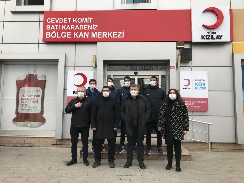 Düzcespor’da Korona virüs tedavisi olarak iyileşen teknik heyet, futbolcular ile yönetim kurulu üyeleri, Kızılay Kan Bağış Merkezi’nde Koronavirüs hastalarına verilmek üzere immün plazmalarını bağışladılar.