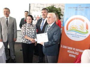 Edirne’de, Gıda, Tarım ve Hayvancılık Bakanlığı, Aile ve Sosyal Politikalar Bakanlığı ve Türkiye Ziraat Odaları Birliği organizasyonunda düzenlenen ’Ortak Kadın Çiftçi Eğitimi’ sonrası, kadın çiftçilere sertifikaları düzenlenen törenle verildi.