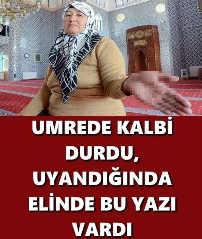 10 Aralık 2022 Cumartesi 21:18Umrede kalbi durdu uyandığında elinde bu yazı vardı! Görünce ş-ok olacaksınız!..Umrede ikindi namazını kılarken birden nefesinin kesildiğini ve ardından Allah’ın kendisine öbür tarafı gösterdiğini iddia eden Aynur Eken elinde bu yazı ortaya çıktı
