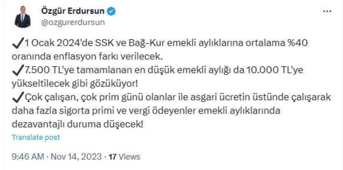 Erdursun, "1 Ocak 2024'de SSK ve Bağ-Kur emekli aylıklarına ortalama %40 oranında enflasyon farkı verilecek. 7.500 TL'ye tamamlanan en düşük emekli aylığı da 10.000 TL'ye yükseltilecek gibi gözüküyor!
