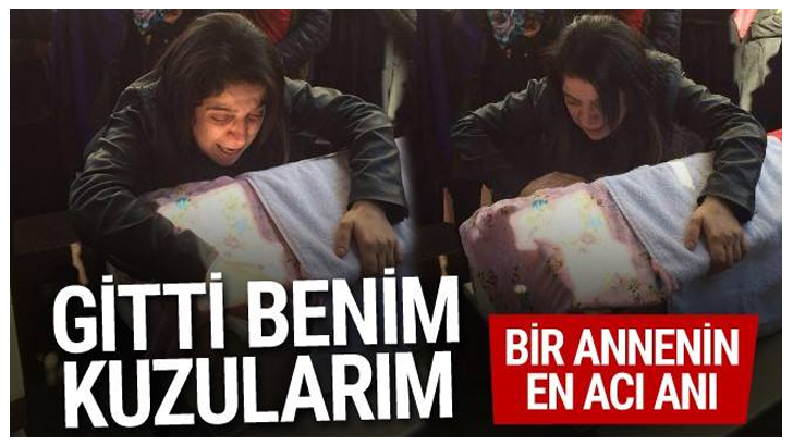 Gözyaşlarına boğulan genç kadın tabuta kapanıp “Biz üçümüzdük annem. Yavrularım, kuzularım. Bu ecel değil. Bizim bizden başka kimsemiz yoktu. Adı güzel, yüzü güzel Elif’im. Benim Hira’m güler bana, dayanamaz. Benim çocuğum emziksiz uyuyamaz. Hiç ayrılmadık biz. Gitti benim kuzularım. Uyan Elif daha yeni botlarını giyemedin. Gül kokulu kuzularım” diye feryat etti.