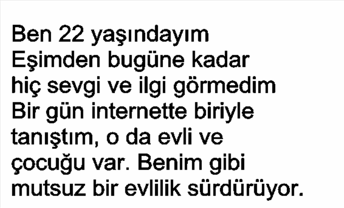 Eşimden bugüne kadar hiç sevgi ve ilgi görmedim. Bir gün internette biriyle tanıştım, o da evli ve çocuğu var. Benim gibi mutsuz bir evlilik sürdürüyor. Daha yüzünü bile görmediğim halde beni arıyor, ilgisini ve sevgisini gösteriyor. Duygularımın esiri oldum. Sevgili Abla, ben 22 yaşındayım.