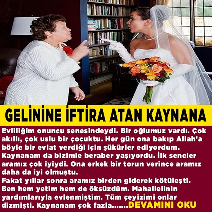 22 Mayıs 2022 Pazar 01:06Evliliğim onuncu senesindeydi. Bir oğlumuz vardı. Çok akıllı, çok uslu bir çocuktu. Her gün ona bakıp Allah’a böyle bir evlat verdiği için şükürler ediyordum. Kaynanam da bizimle beraber yaşıyordu. İlk seneler aramız çok iyiydi. Ona erkek bir torun verince aramız daha da iyi olmuştu. Fakat yıllar sonra aramız birden giderek kötüleşti. Ben hem yetim hem de öksüzdüm. Mahallelinin yardımlarıyla evlenmiştim. Tüm çeyizimi onlar dizmişti. Kaynanam çok fazla bir masraf yapmadığından ayrıca sevinmişti benim gibi bir gelin bulduğu için. Birbirimizden razıydık. Ta ki yan taraftaki eve yaşlıca bir teyze taşınana kadar. O adını hiç anmak istemediğim teyze geldikten sonra özelliklede kimsesizliğim onun gözüne batmaya başlamıştı. Gelip gidip bunu başıma kakıyor, kimsesiz diyordu bana. Ben aldırmıyor hem ona hem de aileme en iyi şekilde bakıyor bir dediklerini iki etmiyordum. Ama bir yandan da üstümdeki baskısını artıran kaynanamın yaptıkları giderek ağrıma gidiyordu. ..............HABERİN DEVAMI İÇİN FOTOĞRAFA TIKLA