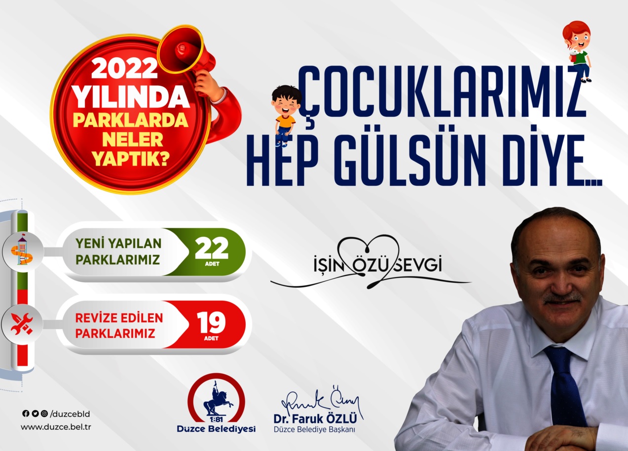 Düzce Belediye Başkanı Dr. Faruk Özlü, çocuklar hep gülsün diye kentte 22 yeni park yaparken 19 çocuk parkınıda revize ettirdi. Çocuklara adeta karne hediyesi oldu.