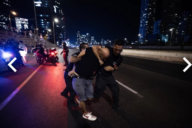 Göstericiler, akşam saatlerinde yargı düzenlemesi karşıtı protestoların sembolü haline gelen Tel Aviv'deki Kaplan Caddesi'ndeki Hükümet Kompleksi'nin önünde toplandı. Yaklaşık bin kişilik gösterici grubu Tel Aviv'in ana arteri Ayalon Otoyolu'nu kapattı, yolda ateş yaktı. İsrail polisi, göstericileri TOMA, atlı birlikler ve güç kullanarak uzaklaştırdı.