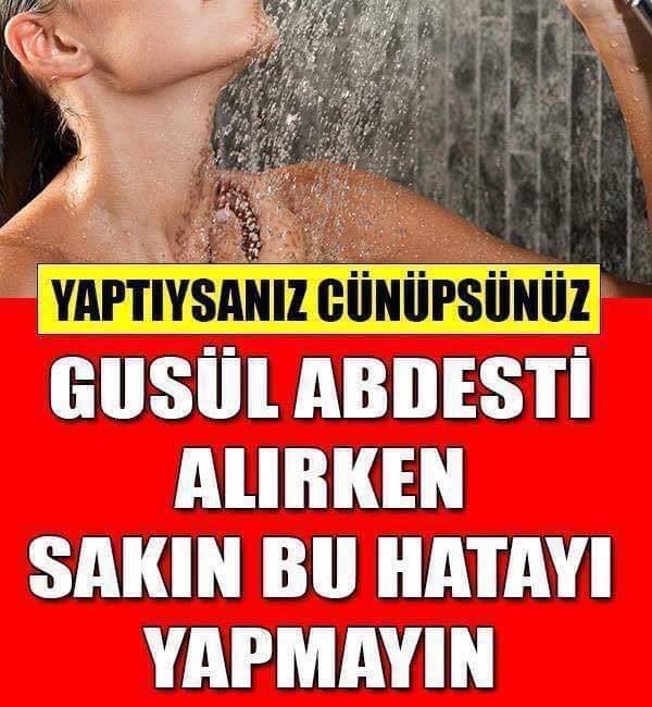 01 Şubat 2020 Cumartesi 20:41Gusül Abdesti alırken yapılan büyük ha-ta! Detaylar..Gusül Abdesti alırken yapılan büyük ha-ta! Gusül Abdesti alırken yapılan büyük ha-ta! Eğer yaparsanız hem abdestiniz olmamış hem de cünüp gezmiş olursunuz….