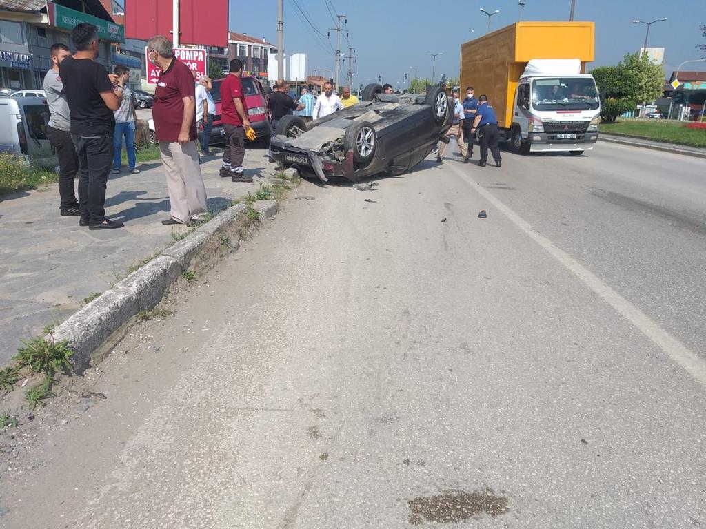 Düzce’de direksiyon hakimiyetini kaybeden sürücü park halindeki minibüse çarpmasının ardından takla attı. Kazada sürücü hafif yaralandı.