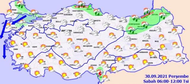 30 Eylül 2021 Perşembe 23:30DOĞU ANADOLU Parçalı yer yer çok bulutlu, Erzincan, Erzurum, Kars, Ardahan, Iğdır, Ağrı ve Hakkâri çevreleri ile Van'ın doğu ilçelerinin aralıklı yağmur ve sağanak yağışlı geçeceği tahmin ediliyor. ERZURUM °C, 16°C Parçalı ve çok bulutlu, öğleden sonra aralıklı yağmur ve sağanak yağışlı KARS °C, 13°C Parçalı ve çok bulutlu, öğleden sonra aralıklı yağmur ve sağanak yağışlı MALATYA °C, 23°C Parçalı bulutlu VAN °C, 21°C Parçalı ve çok bulutlu, öğle saatlerinde doğu çevreleri yağmur ve sağanak yağışlıGÜNEYDOĞU ANADOLU Az bulutlu ve açık geçeceği tahmin ediliyor. DİYARBAKIR °C, 29°C Az bulutlu ve açık GAZİANTEP °C, 28°C Az bulutlu ve açık SİİRT °C, 29°C Az bulutlu ve açık ŞANLIURFA °C, 32°C Az bulutlu ve açık