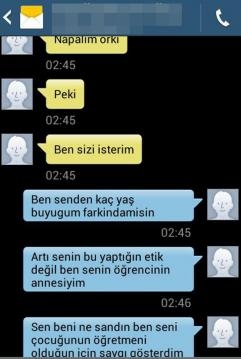 03 Ağustos 2017 Perşembe 19:49YANLIŞ ANLAŞILMA ODU' SAVUNMASI Mesajla taciz ettiği iddialarıyla ilgili olarak kısa bir açıklamada bulunan öğretmen Ö.A., iddiaları kabul etmediğini belirterek, "Böyle bir taciz olayı söz konu değil. Yanlış anlaşılma oldu. Şu anda gerekli makamlarca konu inceleniyor. Ancak üzerime atılan taciz iddialarını kabul etmiyorum" dedi.