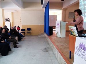 Kent Konseyi Kadın Kimliğinin Geliştirilmesi Çalışma Grubu, Zübeyde Hanım Ortaokulu’nda hanımlara yönelik bir program düzenledi. Söyleşi tarzında gerçekleştirilen programa Kişisel Gelişim Danışmanı Nevin Tümene ve NLP Uzmanı Zeliha Akcan konuşmacı olarak katıldı. Hanımların dikkatle dinlediği söyleşide, Tümene, Öfke ve Uyum konuları üzerine Akcan da, Olumlu Düşünce ve Motivasyon hakkında bilgiler verdi. Kent Konseyi Kadın Meclisi, Karamanlı hanımların katılmaktan büyük memnuniyet duyduğu söyleşilerin farklı mekân ve konularda devam edeceğini bildirdi.