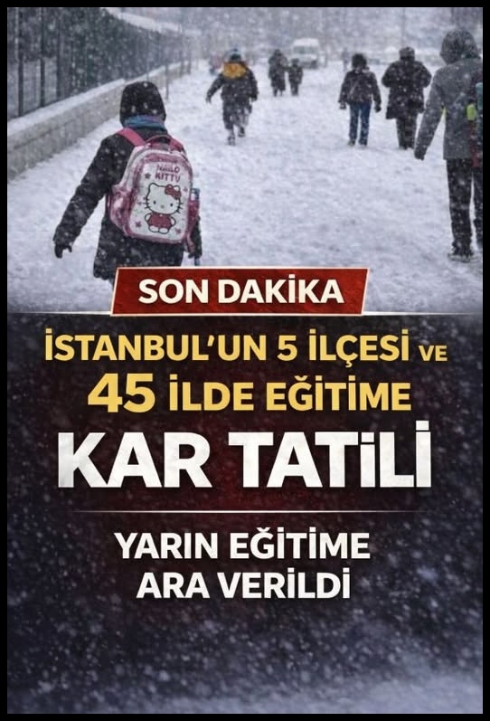 02 Ocak 2026 Cuma 00:05Olumsuz hava koşulları nedeniyle bazı illerde eğitime bir gün süreyle ara verildi. Valilikler tarafından 2 Ocak Cuma günü okulların tatil olduğu iller açıklandı. İstanbul'un beş ilçesinde de eğitim öğretime yarın ara verildi. İşt o iller ve ilçeler... Haberin devamını okumak için Lütfen sonraki sayfaya geçiniz..