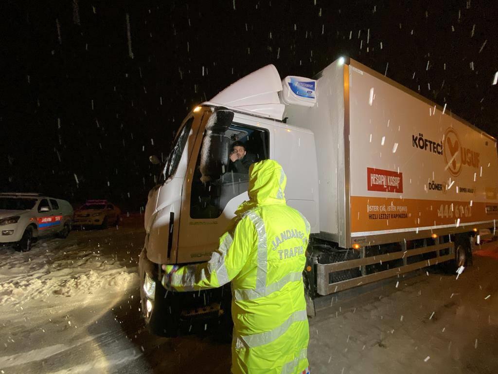 Yolda kalan kamyon ve tır sürücüleri yaklaşık 2,5 kilometrelik araç kuyruğu oluştururken, Akçakoca İlçe Jandarma ekipleri de sürücülere zincirsiz araç kullanmamaları konusunda uyarılarda bulunuyor.