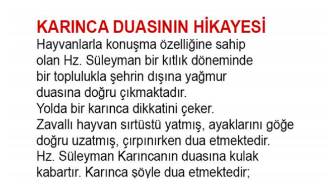 Hz. Süleyman Karıncanın duasına kulak kabartır. Karınca şöyle dua etmektedir; “Allah’ım bizi Sen var ettin… Ve Senin rahmetin olmadan biz yaşayamayız Ya bize su verirsin ya da bizi helak edersin. Emir, ferman senindir.” Hz.Süleyman ‘ın gözleri yaşarır. Ve az sonra Hz Cebrail’ın getirdiği bir haberle de coşar, taşar, ağlamaya başlar. Cebrail, o karıncanın duasının kabul edildiği haberini getirmiştir.” Peygamber yanındaki topluluğa döner: “Dönün” der “Siz başkasının duasıyla sulanacaksınız.