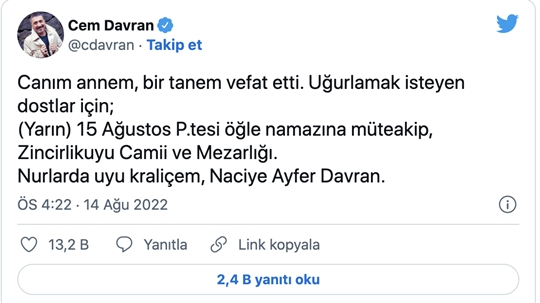 Davran paylaşımında “Canım annem, bir tanem ve-fat etti. Uğurlamak isteyen dostlar için; (yarın) 15 Ağustos Pazartesi öğle namazına müteakip, Zincirlikuyu Camii ve Me-zarlığı. Nurlarda uyu kraliçem, Naciye Ayfer Davran.” ifadelerini kullandı. Haberimizin devamını okumak için diğer sayfaya geçiniz fotografa tıklayarak diğer sayfaya geçebilirsiniz