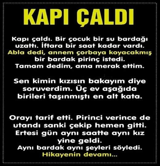 12 Temmuz 2022 Salı 22:48Kapı çaldı. Bir çocuk bir su bardağı uzattı. İftara bir saat kadar vardı. Abla dedi, annem çorbaya koyacakmış bir bardak pirinç istedi. Tamam dedim, ama merak ettim. Sen kimin kızısın bakayım diye soruverdim. Üç ev aşağıda birileri taşınmıştı en alt kata. Orayı tarif etti. Pirinci verince de utandı sanki çekip hemen gitti. Ertesi gün aynı saatte aynı kız yine geldi. Aynı bardak aynı şeyleri söyledi.