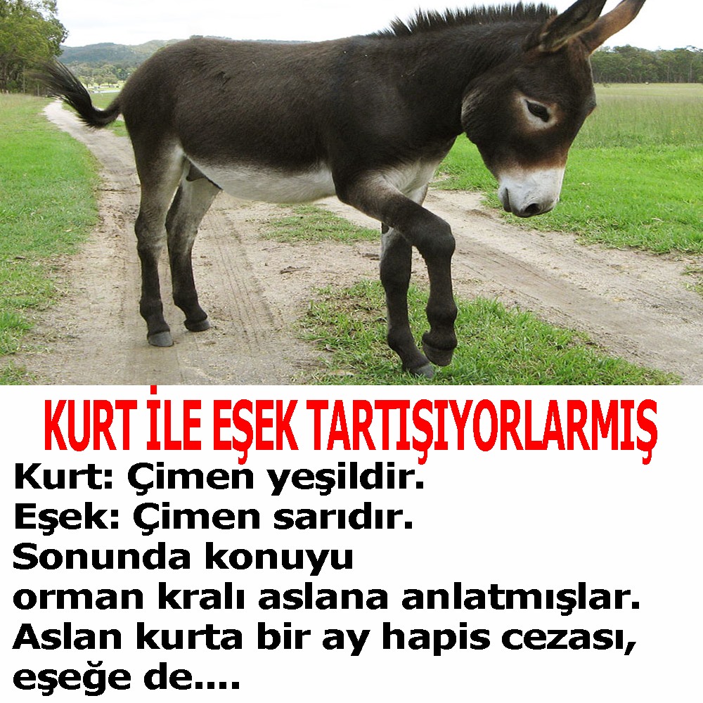 10 Kasım 2021 Çarşamba 22:49Kurt: Çimen yeşildir. Eşek: Çimen sarıdır. Sonunda konuyu orman kralı aslana anlatmışlar. Aslan kurta bir ay hapis cezası, eşeğe de özgürlük kararı vermiş. Kurt şaşkınlıkla aslana yaklaşmış ve sormuş: Hakikaten sen de çimeni sarı mı görüyorsun? DEVAMI İÇİN DİĞER SAYFAYA GEÇİNİZ...