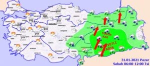 01 Şubat 2021 Pazartesi 19:16Bingöl, Bilecik, Bursa, Çorum, Çanakkale, Denizli, Giresun, Gümüşhane, Hatay, Isparta, Mersin, İzmir, Kastamonu, Kayseri, Konya, Kocaeli, Kütahya, Manisa, Muğla, Muş, Nevşehir, Ordu, Rize, Niğde, Sakarya, Samsun, Sinop, Sivas, Tokat, Trabzon, Tunceli, Uşak, Zonguldak, Aksaray, Karaman, Bayburt, Bartın, Yalova, Osmaniye, Karabük ve Düzce yer aldı. Kahramanmaraş, Malatya, Diyarbakır, Elazığ ve Adıyaman için de turuncu kodlu u-yarı verildi. SARI KODLU U-YARI NEDİR? Hava durumu potansiyel t-hlike-lidir: Tahmin edilen meteorolojik hadise olağandışı olmamakla beraber, meteorolojik şartlardan etkilenebilecek faaliyetler konusunda di-kkatli olunmalıdır. TURUNCU KODLU U-YARI NEDİR? Hava durumu t-hlik-elidir: Tahmin edilen meteorolojik hadise sıklıkla görülmemektedir. H-asar ve kayıpların oluşması muhtemeldir. Çok te-dbirli olmalı, güncel meteorolojik koşullar ve tahminler takip edilmelidir.