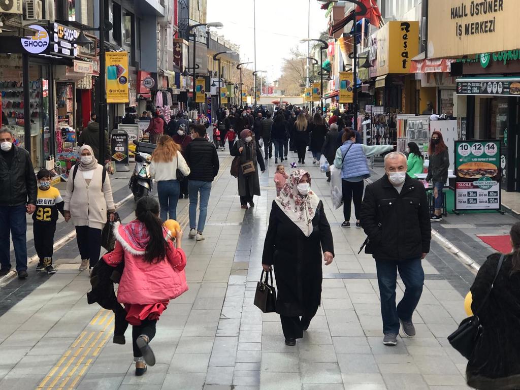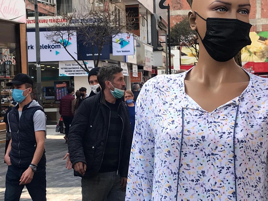 Kentin en yoğun caddelerinden Gaziantep Caddesi’ndeki maskeli cansız manken renkli görüntülere sahne olurken, yaşanan insan yoğunluğu ise tedirgin etti.