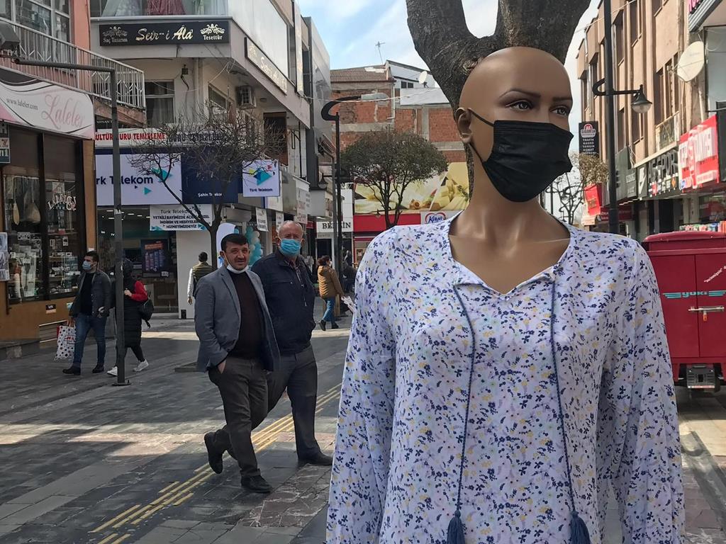 Koronavirüs risk haritasında turuncu kategori ile yüksek riskli iller arasında yer alan Düzce’de, esnaf maske kullanımına dikkat çekmek için cansız mankene maske taktı.